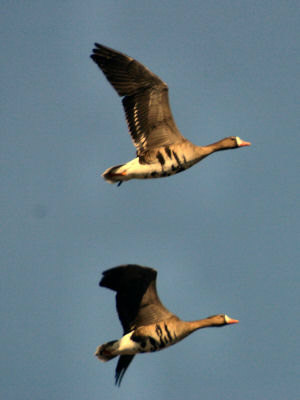 A pair of Greater White-fronted Geese shortly after launch.